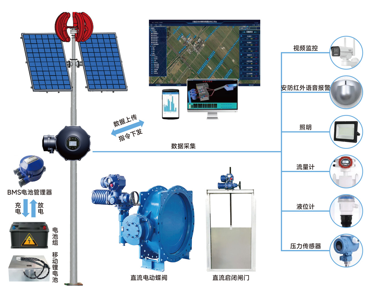 由太陽能光伏板和小型風(fēng)力發(fā)電機(jī)為蓄能電池組充電,電池組有BMS電池管理軟件管控,為永磁無刷直流電機(jī)的各類驅(qū)動裝置供電,同時(shí)為視頻監(jiān)控,壓力、流量、液位傳感器,照明等供電